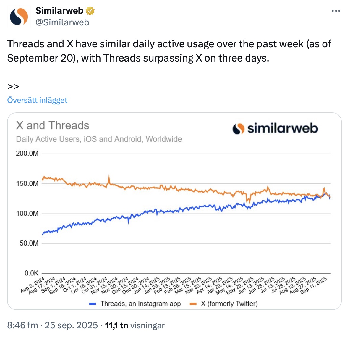 Kurvorna för de båda tjänsternas användande har stadigt närmat sig varandra. Mest för att Threads har ökat, men också för att X har minskat. Faktum är att Threads redan har varit större än X några dagar senaste veckorna. Och om kurvorna fortsätter som de har gjort så är det en fråga om ”dagar” innan vi får se ett – sannolikt – permanent skifte.